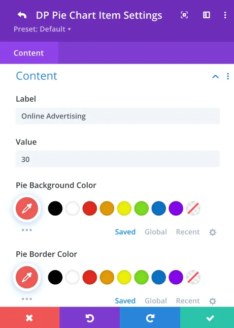 See how you can quickly configure pie chart segments, colors, labels, and values in the module settings. These controls give you full creative freedom to build engaging pie charts that enhance your Divi-built pages.